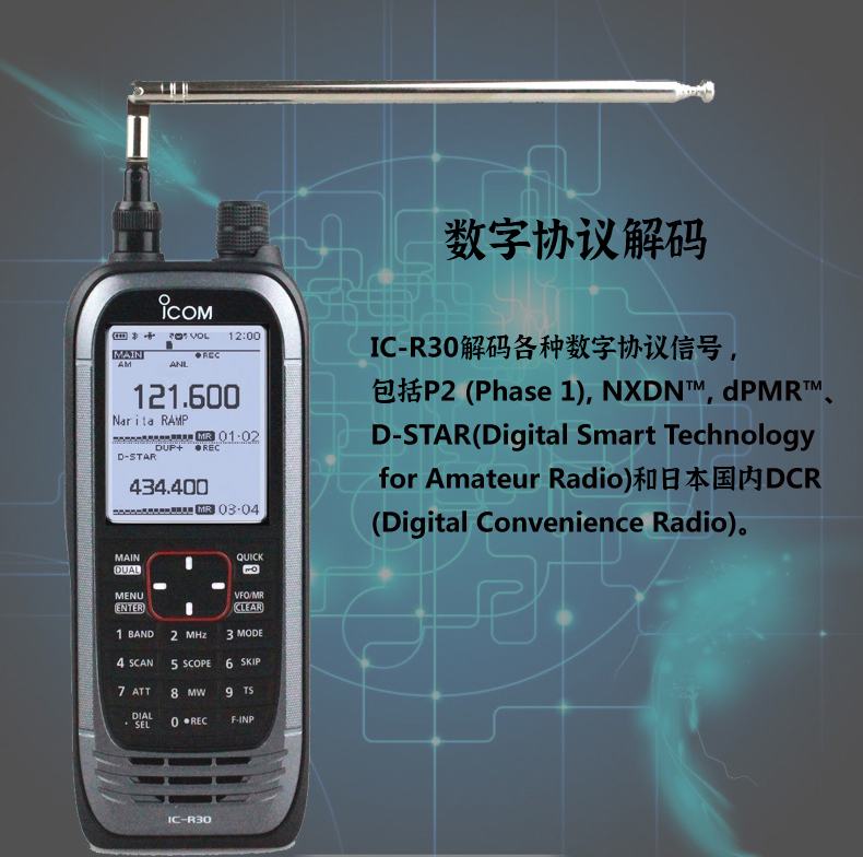 IC-R30解碼各種數字協議型號,包括P25(Phase1),NXDN  DPMR  D-STAR(Digital  Smart Technology for Amateur Radio)和日本國內DCRDigital Convenience Radio.