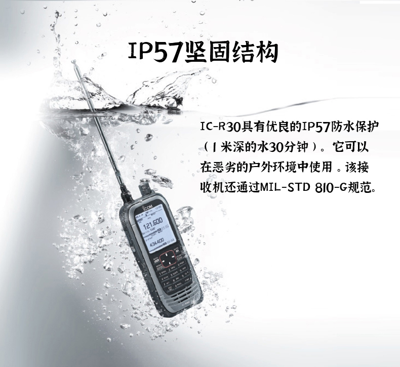 IP57堅固結構  IC-R30具有優良的IP57防水保護(1米深的水30分鐘)。它可以在惡劣的戶外環境中使用。該接收機還通過MIL-STD 810-G規范