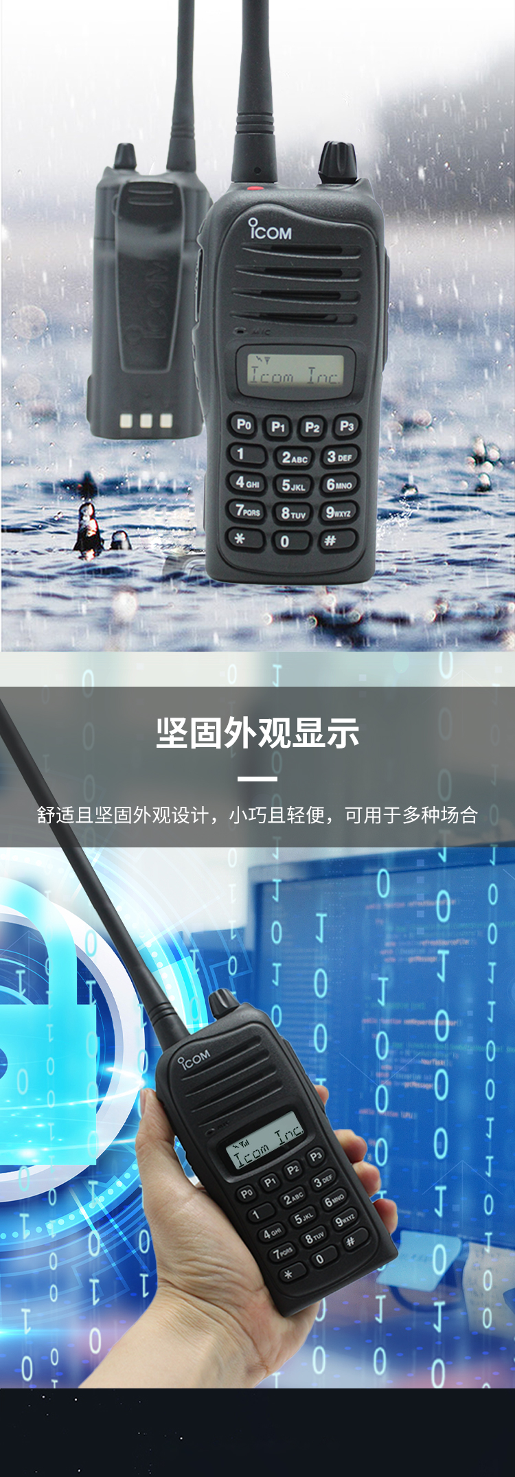 IC-F3022T通過IP54防塵,防滴濺測試。全鋁壓鑄底板,可在各種天氣環境下可靠使用。